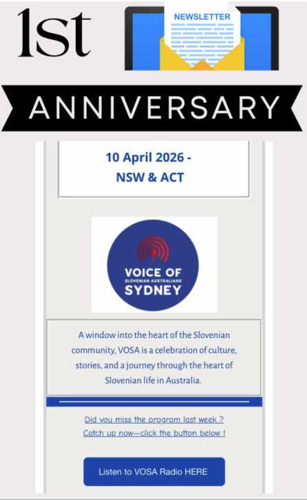 On tomorrow’s show, we will mark the first anniversary of the VOSA Newsletter by reflecting on its progress, exploring its impact so far, and looking ahead to plans for expanding and strengthening the service. Plus, we will be joined by a Slovenian storyteller and author who recently visited Australia. As usual we will feature your special messages, story and word of the week and plenty of Slovenian music.