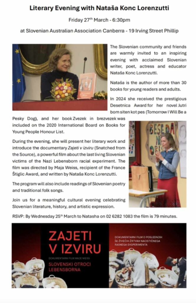 We are honoured to welcome Nataša Konc Lorenzutti for a special literary evening, including a screening of the documentary film Zajeti v izviru.