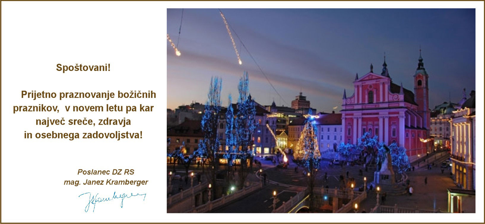 Zelo me veseli, da vas lahko nagovorim in vam zaželim lepe Božične praznike in srečno novo leto kot novi minister za Slovence v sosednjih državah in po svetu v Vladi Republike Slovenije. Nov sem v dvojnem pomenu. Po eni strani je to nov položaj v vladi, ki do sedaj ni obstajal, saj je Urad za Slovence v zamejstvu in po svetu vodil državni sekretar. Ta novost naj bi pomenila, da želi Slovenija, Vlada Republike Slovenije, dati večji poudarek ohranjanju in vzpodbujanju slovenstva ter sodelovanju s Slovenci po svetu. Po drugi strani pa sem tudi jaz sam nov v politiki, s katero se do sedaj sploh nisem ukvarjal, nisem bil član nobene politične stranke in tudi sedaj nimam nobenih političnih ambicij.