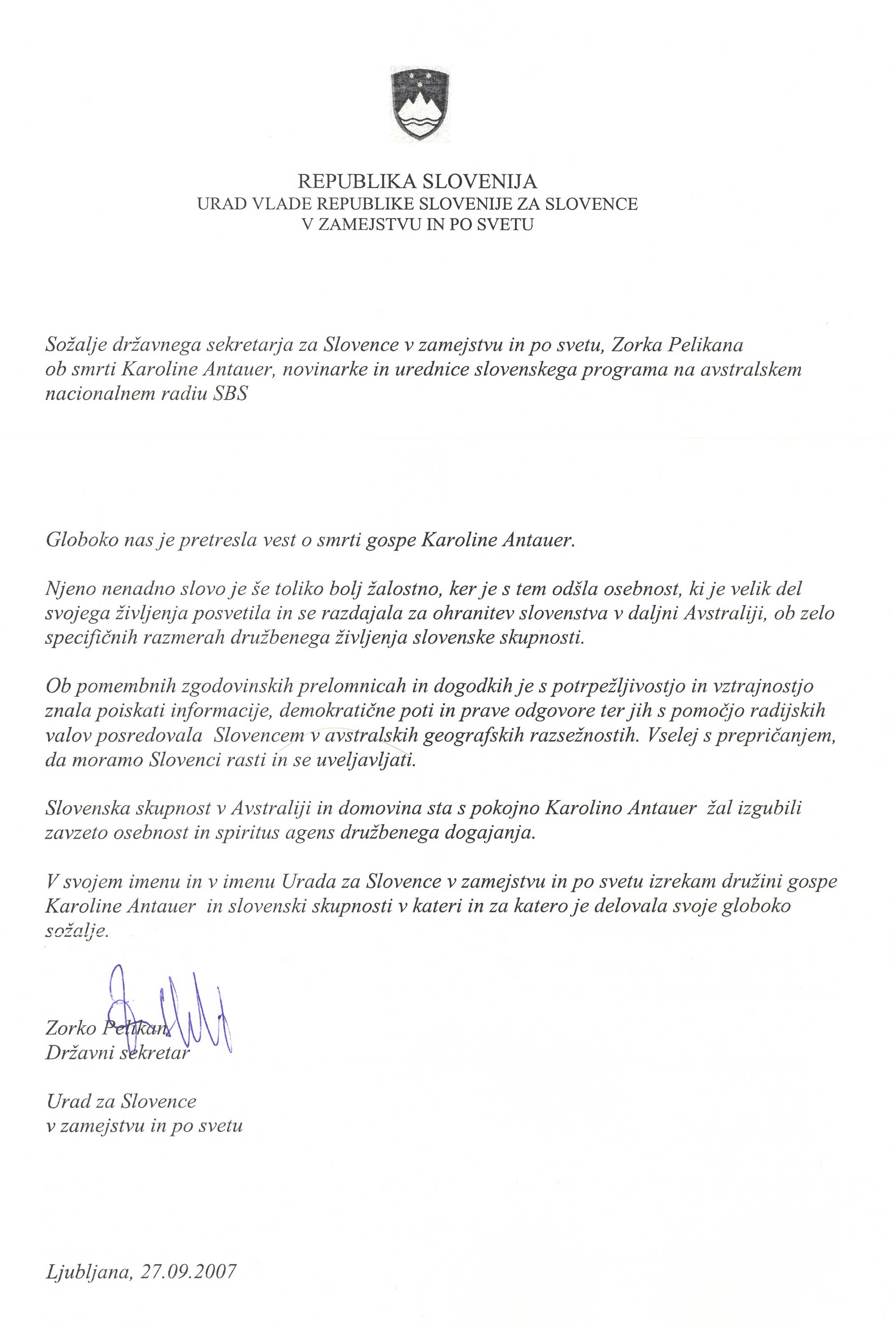 Zelo mi je zal, da se zaradi odsotnosti ne bom mogel udeleziti poslovilne svecanosti vendar sem v mislih stalno z Vami. Karolinina smrt me je zelo prizadela, saj mi je tudi sama bila v veliko oporo ob slovesu od moje Elice.