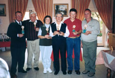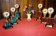 Trophies for First, Second and Third place for red and white home made wine with the Golden Jubillee logo. |
