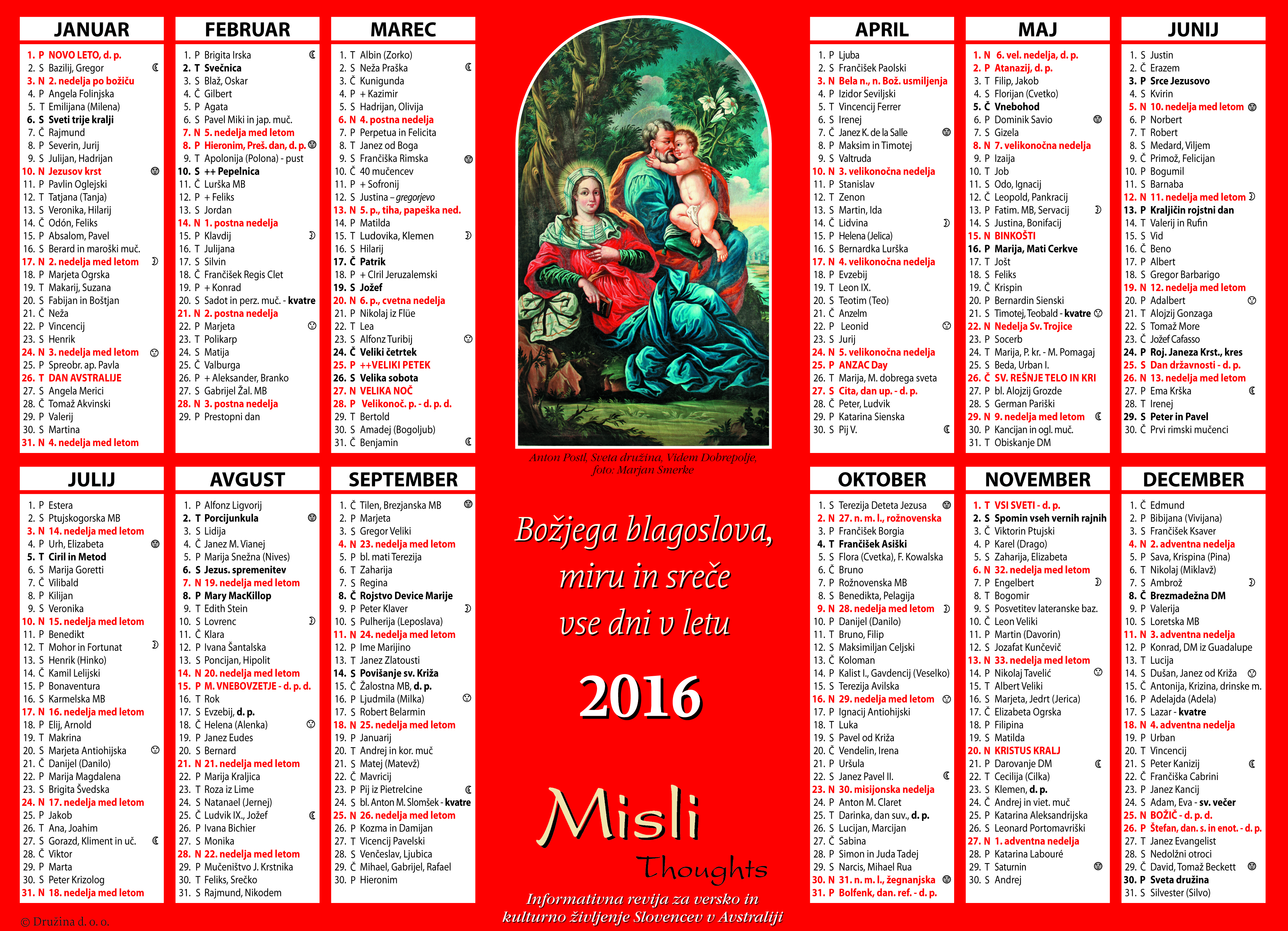 S HVALEZNOSTJO se vseh vas v Adelaidi spominjamo tudi pri sv. Cirilu in Metodu v Melbournu ter pri sv. Rafaelu v Sydneyu. Povedati vam moramo, da ste nam v veliko veselje in vzpodbudo. Pater Janez je veckrat govoril in pisal o »naši majhni skupnosti«. Toda majhna slovenska adelaidska skupnost je še kako ziva in mocna! Ni cudno, da je p. David tako rad med vami in da ste/smo v kratkem casu ze tako veliko postorili. Vse zegne za bozicne praznike in na veselo snidenje ob prazniku Vaše cerkve, prvo nedeljo po bozicu, na praznik Svete druzine, 28. decembra 2014. Takrat bomo p. Davida tudi slovesno razglasili za novega voditelja Slovenskega misijona in rektorja cerkve Svete druzine v Adeladi. Tudi vošcili in nazdravili bomo vsemu dobremu v iztekajocem se letu 2014 ter v odprtosti milosti prihajajocemu letu Gospodovemu 2015. Bog zivi!