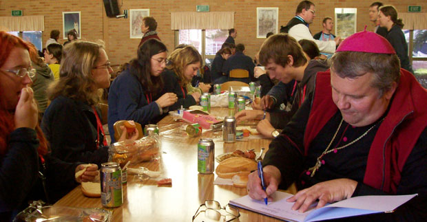 Škof med kosilom podpisuje spominsko knjigo v dvorani verskega središča